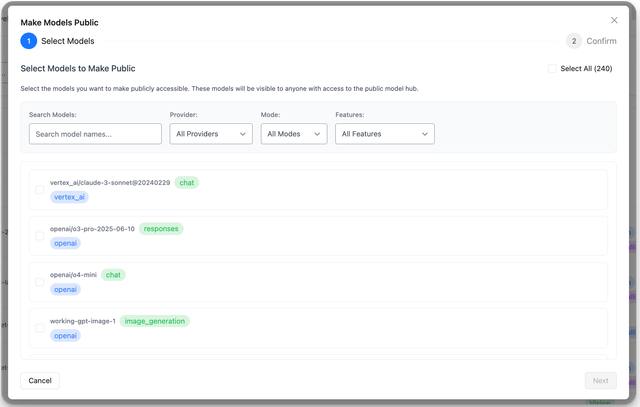 Admin can select models to expose on public model hub -> Users can go to the public url (/ui/model_hub_table) and see available models.